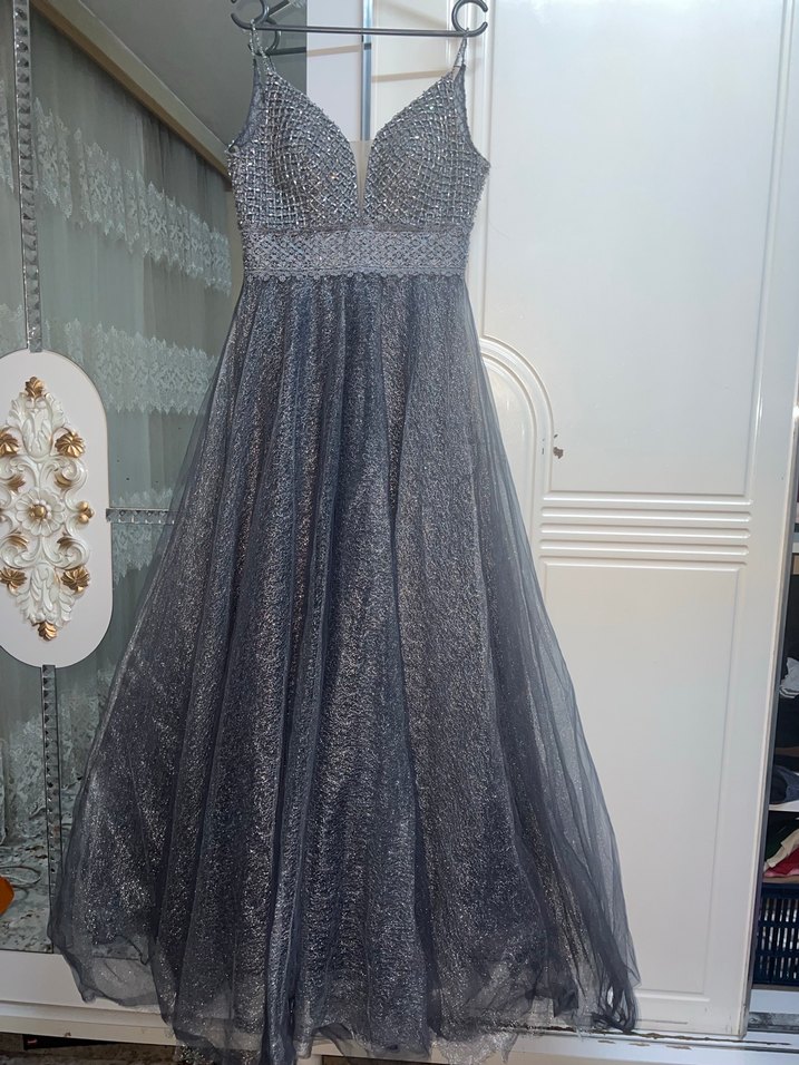 Kolsuz, gri renkli bu nişan elbisesi, V yaka ve drapeli detaylara sahip. Klasik zarafet ve modern klasik tarzı bir araya getirir. Uzun ve desensizdir.