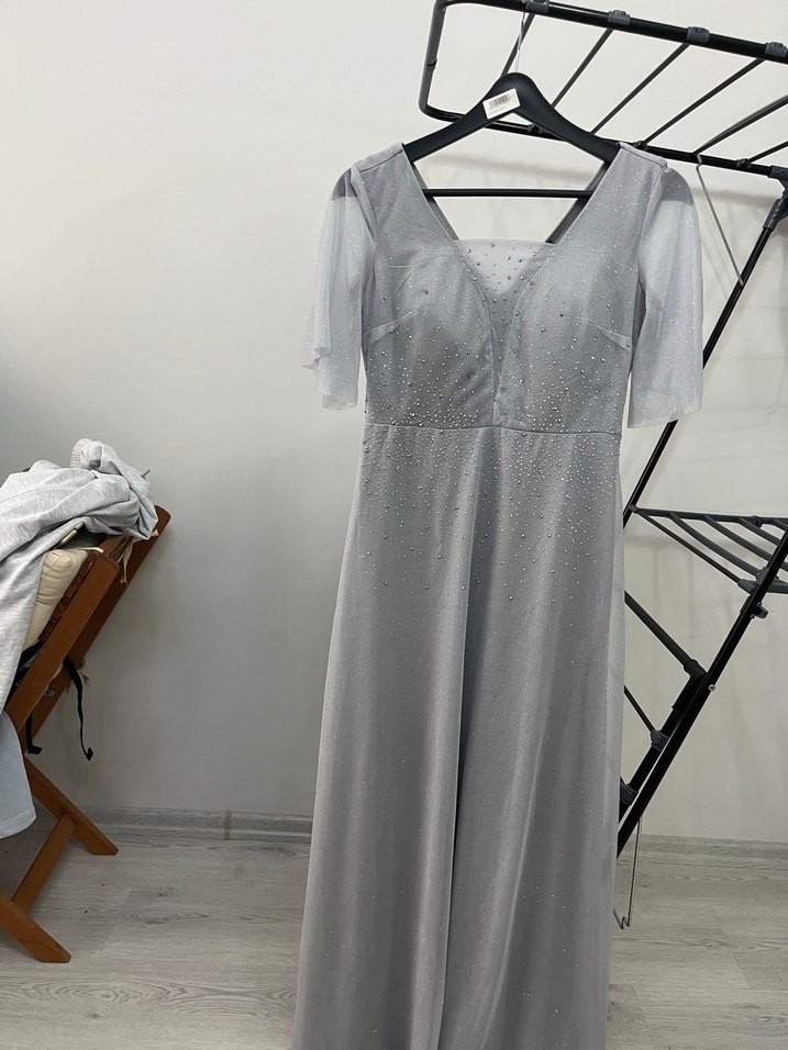 Gri Uzun V Yaka Drapeli Abiye Elbise