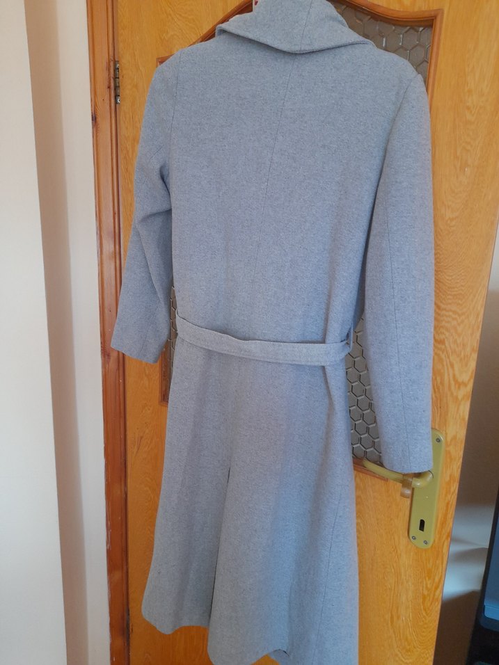 Gri renkte, uzun yün kumaştan yapılmış, kemerli ve kesimli yakalı hamile kabanı. Uzun kollu, rahat kesim ve desensiz tasarıma sahiptir.