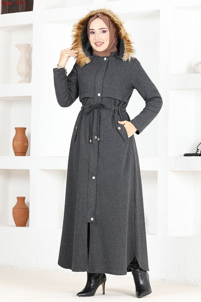 Gri Uzun Yün Kadın Kaban Kürklü Kapüşonlu