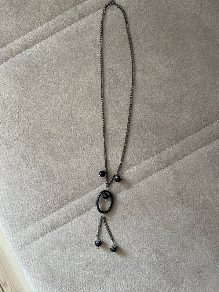 Gri renkte uzun zincir detaylı, yılan desenli ve siyah boncuklu minimalist, avangart tarza uygun kadın kolye.