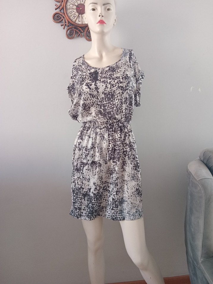 Gri renkli, gevşek kesim ve drapeli tasarıma sahip mini pareo, kısa kollu ve V yakalıdır. Bağlamalı