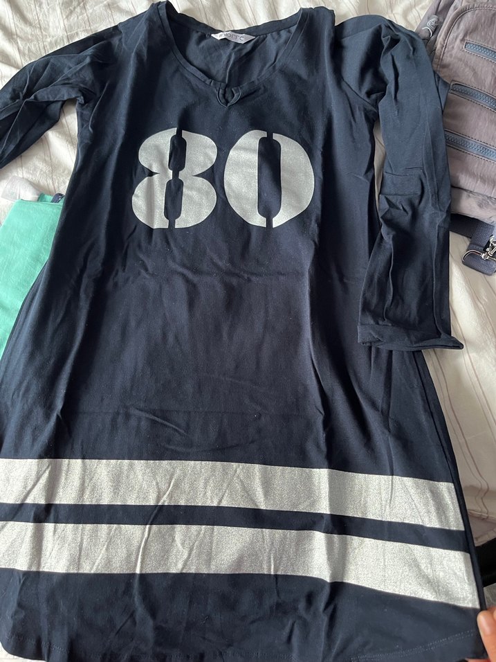 Pamuk kumaştan, bol kesim, uzun kollu ve V yaka gecelik . Üzerinde 80 baskısı ve çizgi deseni bulunan rahat kullanımlık model.