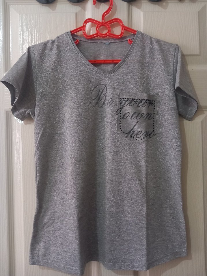 Pamuklu gri tişört, V yakalı ve kısa kollu, rahat kesim. Baskılı tasarım ve göğüste küçük cep bulunur, günlük sokak stili için uygundur.