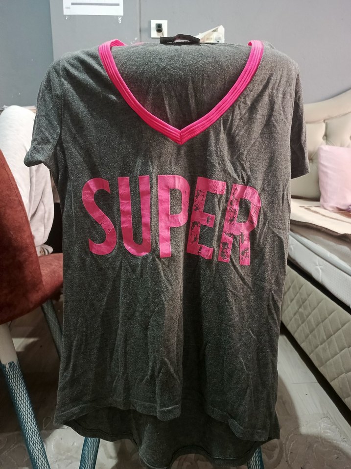 Gri V yaka tişört, kısa kollu ve bol kesimdir. Üzerinde 'SUPER' baskısı bulunur. Sokak modasına uygun.