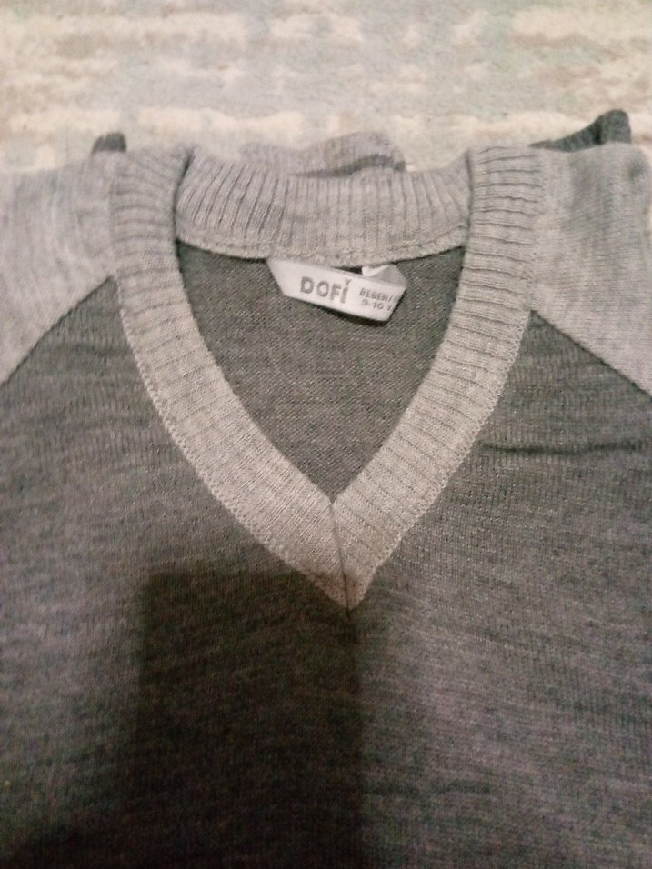 Gri tonlarda, yün kumaştan, V yaka ve uzun kollu, vücuda oturan kadın kazak. Örgü dokusu ve normal boyuyla günlük kullanıma uygundur. Etiketinde DOFi yazısı var.