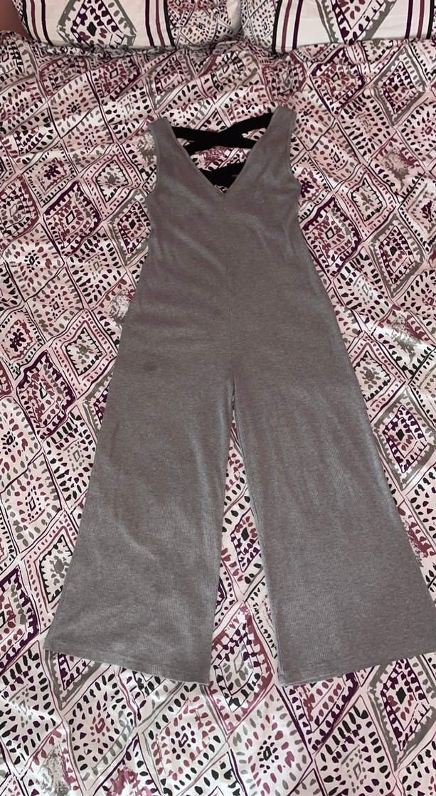 Gri renkte, V yakalı, dantel detaylı, bol kesim ve kolsuz uzun kadın tulumu. Rahat ve bohem tarzı yansıtır.