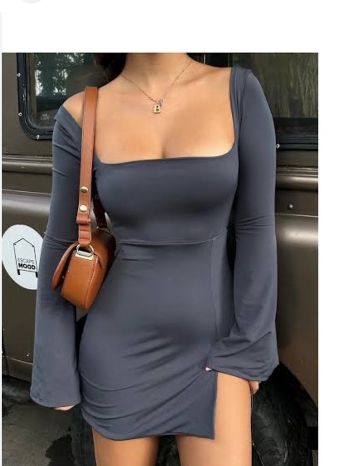 Deri görünümlü, dar kesim gri mini elbise, V yakalı ve uzun kollu. Tokalı detay içerir, romantik akşamlar için uygun.