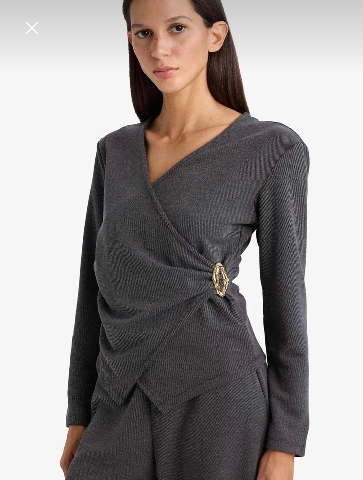 Gri uzun kesim kazam, V yaka ve tokalı drapeli tasarıma sahiptir. Yumuşak sentetik kumaştan yapılmıştır ve ofis için uygundur. GİYİLMEDİ