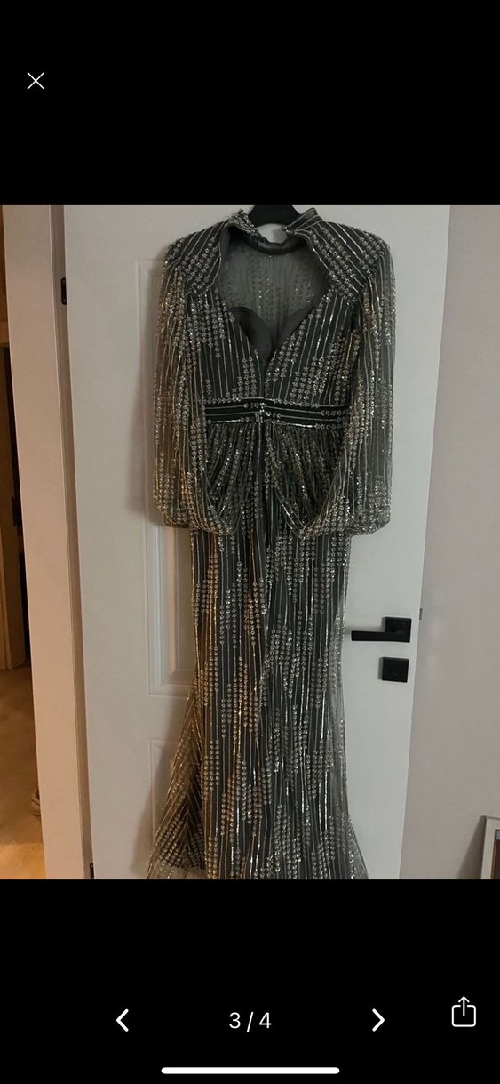 V yaka ve ince askılı, drapeli desenli gri uzun abiye elbise. Avant-garde tarzıyla parti için uygundur.