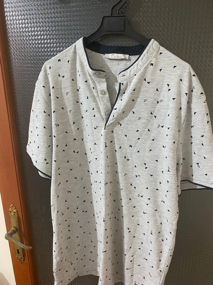 Pamuk kumaştan, gri renk ve küçük baskılı desenli, V yaka kısa kollu düğmeli erkek polo tişört. Rahat kesim ve günlük sokak stili için uygundur.