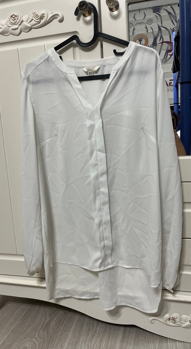 Bu kadın gömlek, uzun kollu ve V yaka tasarıma sahip bol kesimdir. Düğmeli önde ve ipeksi, desensiz kumaştan üretilmiştir, ofis ve günlük kullanıma uygundur. Beyaz çok efil efil ancak iç gösteriyor bilginiz olsun. Kalçayı kapatıyor uzunluk olarak hiçbir sorunu yok tertemiz