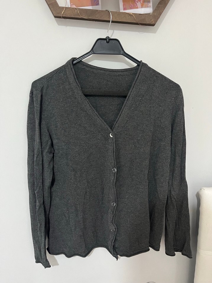Gri renkte, uzun kollu, düğmeli ve V yaka kadın hırka. Keten kumaş ve rahat kesimiyle günlük kullanıma uygun