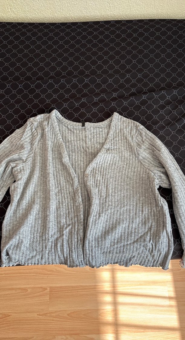 Gri renkli, uzun kollu ve V yaka düğmeli kadın hırkası. Yumuşak keten kumaştan, bol kesim ve normal midi boyda, günlük kullanım için uygun.