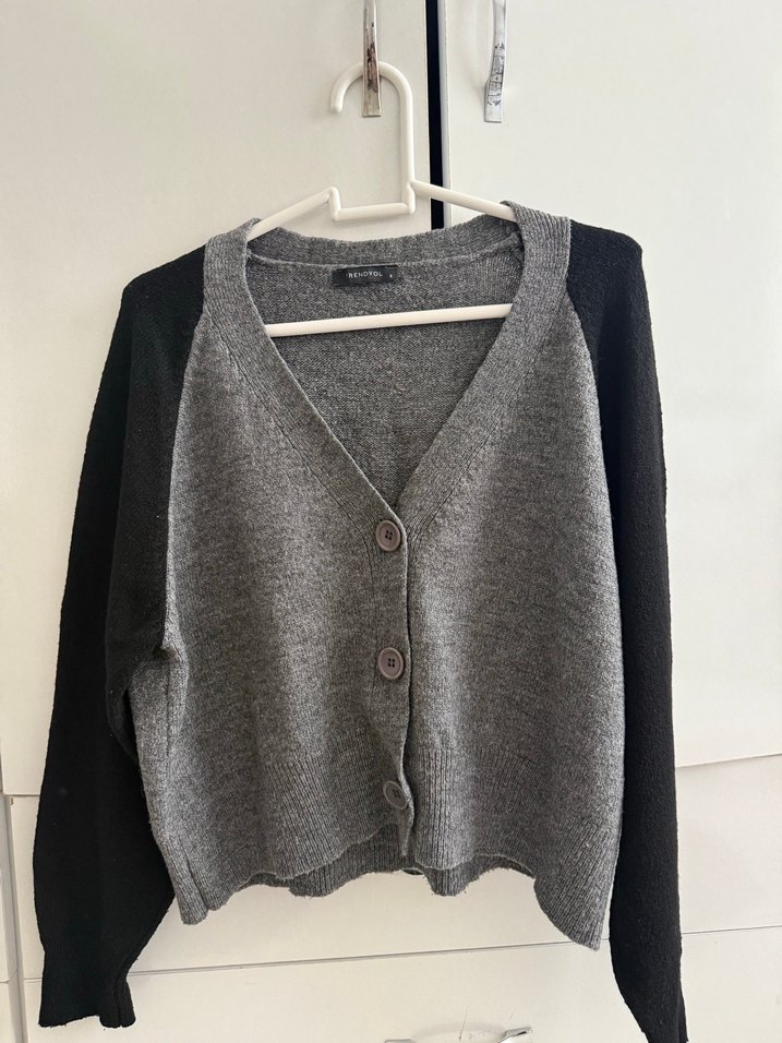 Gri ve siyah renklerde, düğmeli, V yaka, uzun kollu, midi boy, bol kesim kadın hırkası. Rahat ve gündelik kullanıma uygun örme kumaş.
