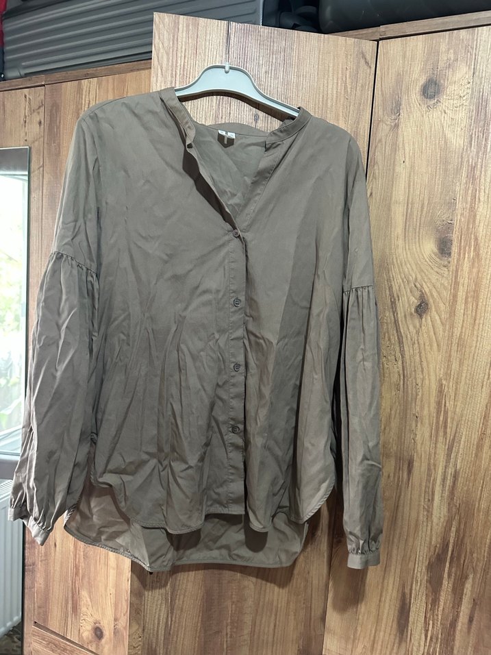 Gri keten kumaştan, düğmeli, V yaka ve uzun kollu, bol kesim günlük kullanıma uygun kadın gömleği.