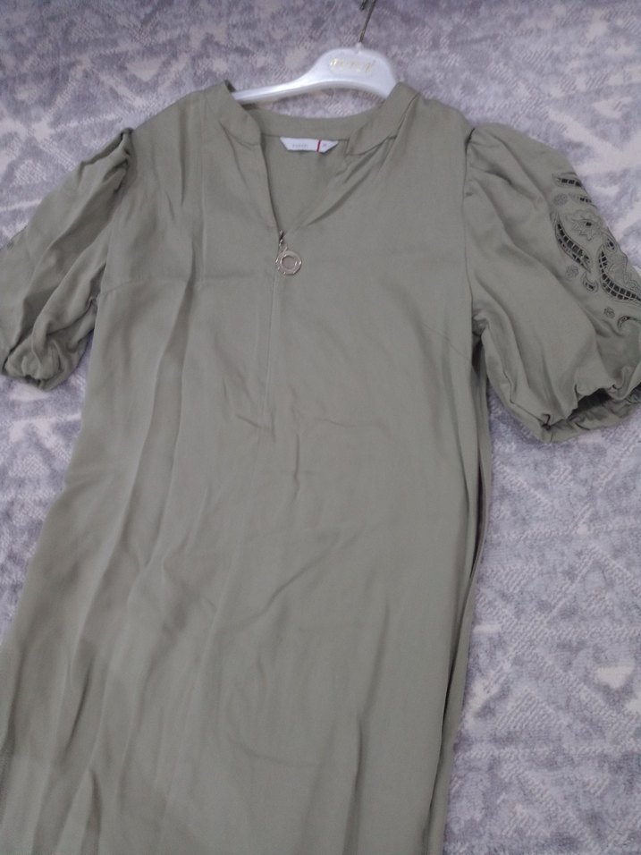 Gri uzun elbise, kısa balon kollu ve dantel detaylıdır. V yaka ve düğme detaylarıyla rahat ve bol kesimdir.