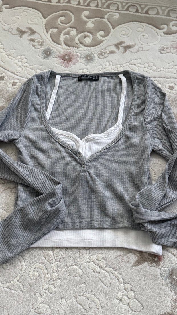 Gri renkte, düğmeli ve V yakalı, uzun kollu, rahat kesim kadın kazak. Yumuşak keten kumaştan, midi uzunlukta, günlük kullanım için uygundur.