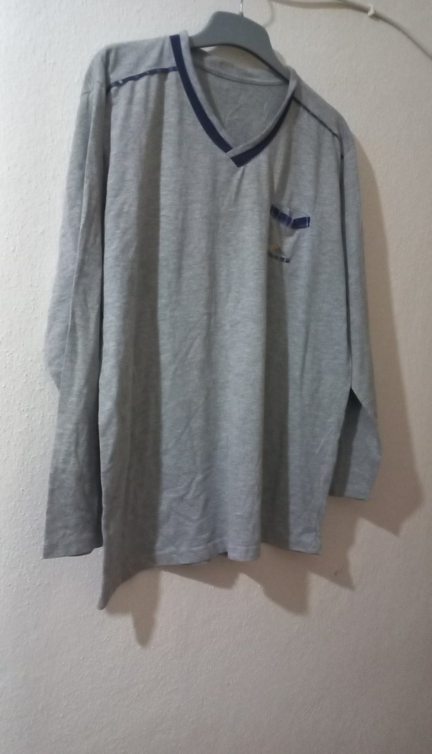 Gri renk, V yaka ve uzun kollu keten erkek gece kıyafeti Bol kesim ve normal boyda,