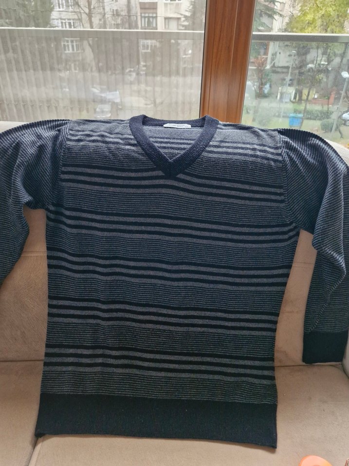 Gri çizgili, V yaka ve uzun kollu erkek triko kazak. Yün dokusu ve bol kesimiyle rahat bir kullanım sunar. Günlük, rahat stil için uygundur. kazak ölçüleri boy 70 santim en koltuk altından 54 santim en bel genişliği 51 santim kol evi genişliği 24 santim kol boyu 59 santim