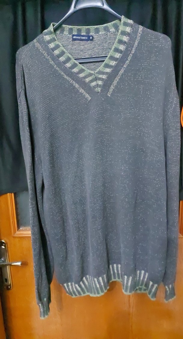 Gri renkte, V yaka ve uzun kollu erkek triko kazak. Örme keten kumaştan, bol kesim ve sade desensiz tasarım, günlük rahat stil için uygundur.
