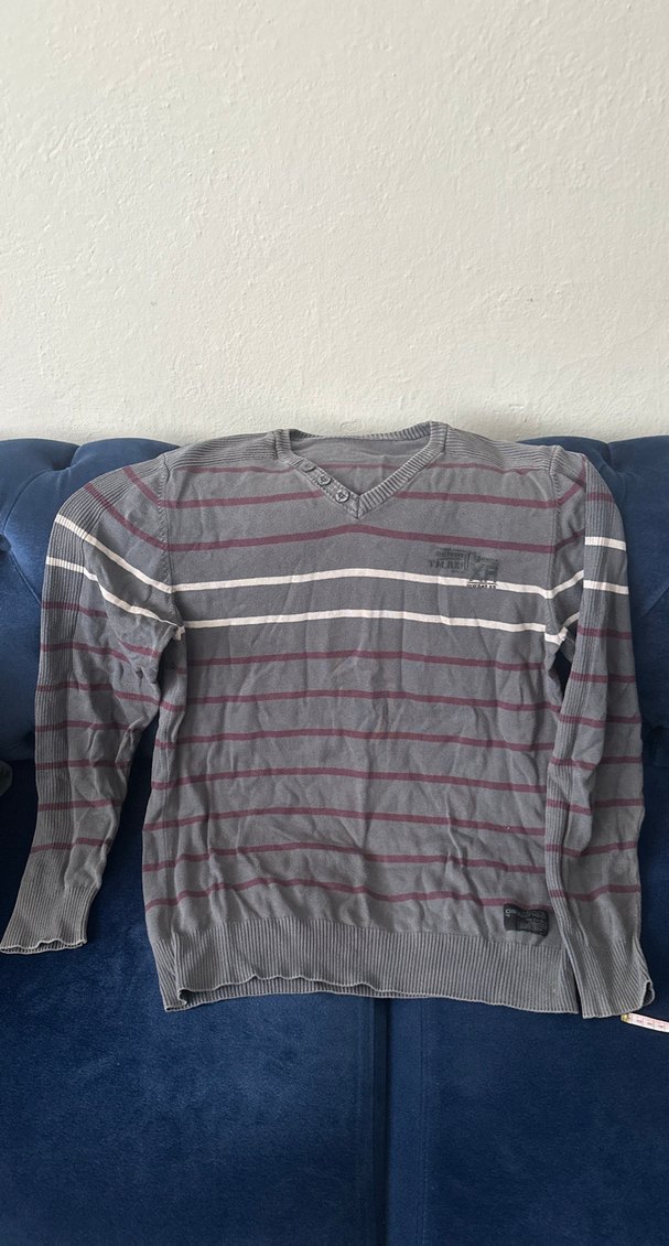 Gri renkli, V yaka ve uzun kollu erkek triko kazak. Keten kumaştan örülmüş, rahat kesim ve günlük sokak stili için uygundur. İki koltuk arası 55 cm