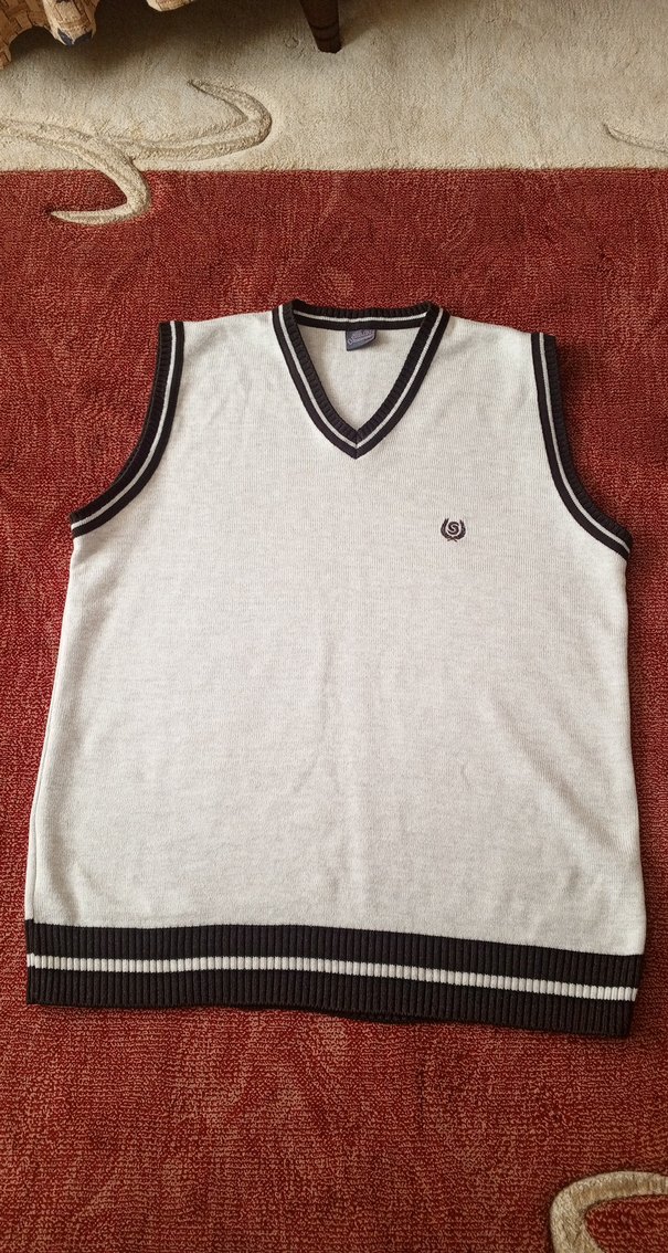 Gri renkte, yumuşak yün kumaştan örülmüş, V yakalı ve kolsuzerkek kadın süveter. Rahat kesimiyle günlük kullanıma uygundur. iki kol aradı 55 cm boy 67 cm