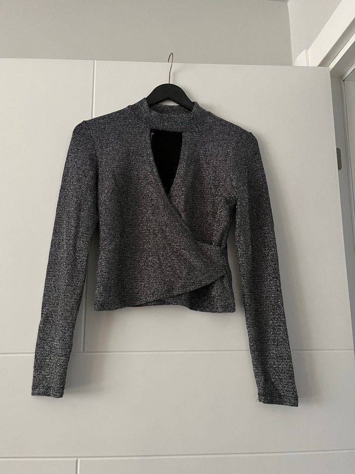 Gri renkli, V yaka ve uzun kollu, fitilli dokulu kadın bluz. Kısa boyda, rahat ve şık, ofis için uygun sentetik kumaştan üretilmiştir.