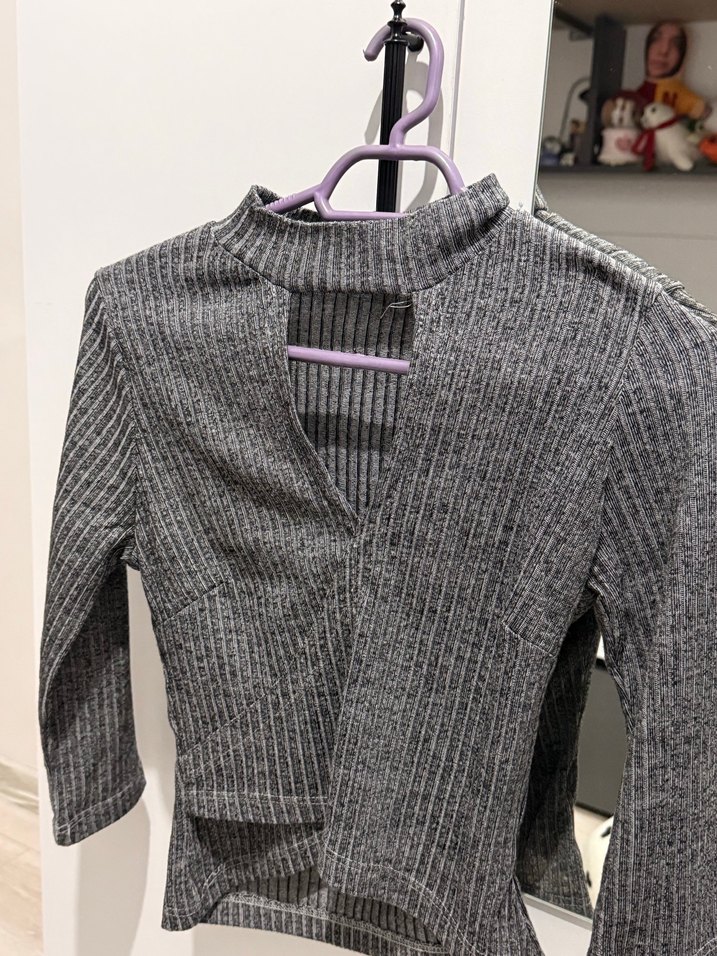 Fitilli gri triko, V yaka ve uzun kollu, kısa boyda kadın kazak. Rahat sokak stili için uygun, sıcak tutar.