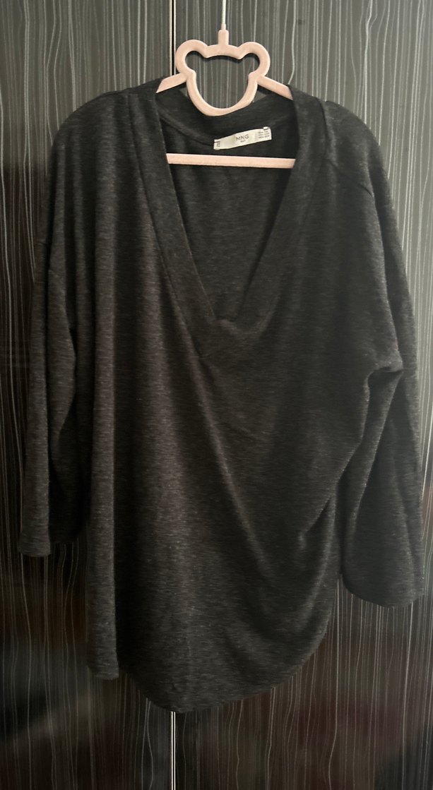 Gri renkte, V yaka, uzun kollu ve bol kesim hamile hırkası. Keten dokulu kumaştan, rahat ve sade tarzda günlük kullanıma uygun.