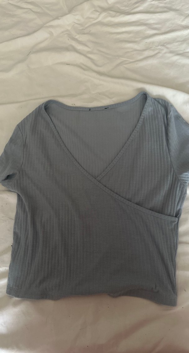 Gri renkte, V yaka ve kısa kollu, yumuşak keten kumaştan üretilmiş, pile detaylı, vücuda oturan hamile bluzu. Günlük rahat kullanıma uygundur.