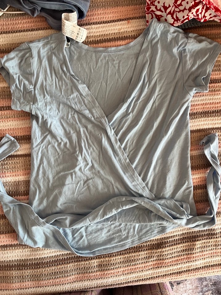 Gri renkte, V yakalı ve drapeli tasarıma sahip, rahat kesim hamile bluzu. Yumuşak keten kumaştan üretilmiş, günlük kullanıma uygun.