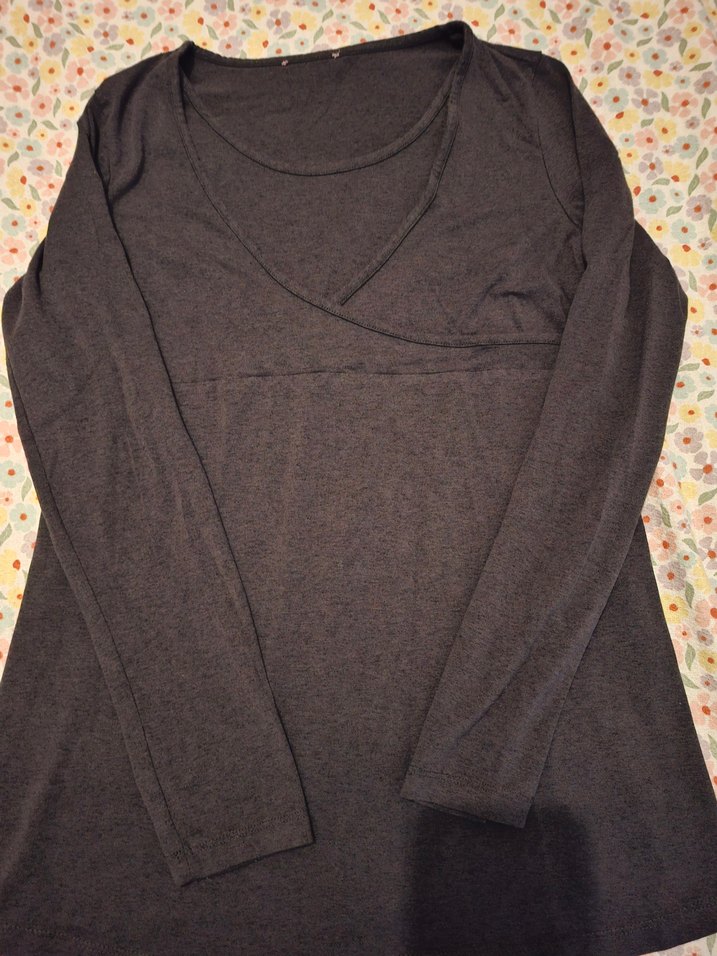 Gri renkte, V yakalı ve uzun kollu, rahat kesimli hamile tişörtü. Yumuşak keten kumaştan, drapeli tasarımıyla günlük kullanım için uygundur.