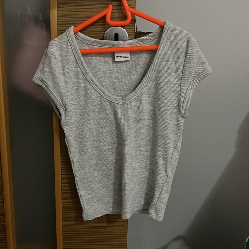 Pamuklu, gri renkte, V yaka ve kısa kollu kadın tişörtü. Günlük kullanıma uygun, rahat ve sokak stiline uygun kesimde tasarlanmıştır.