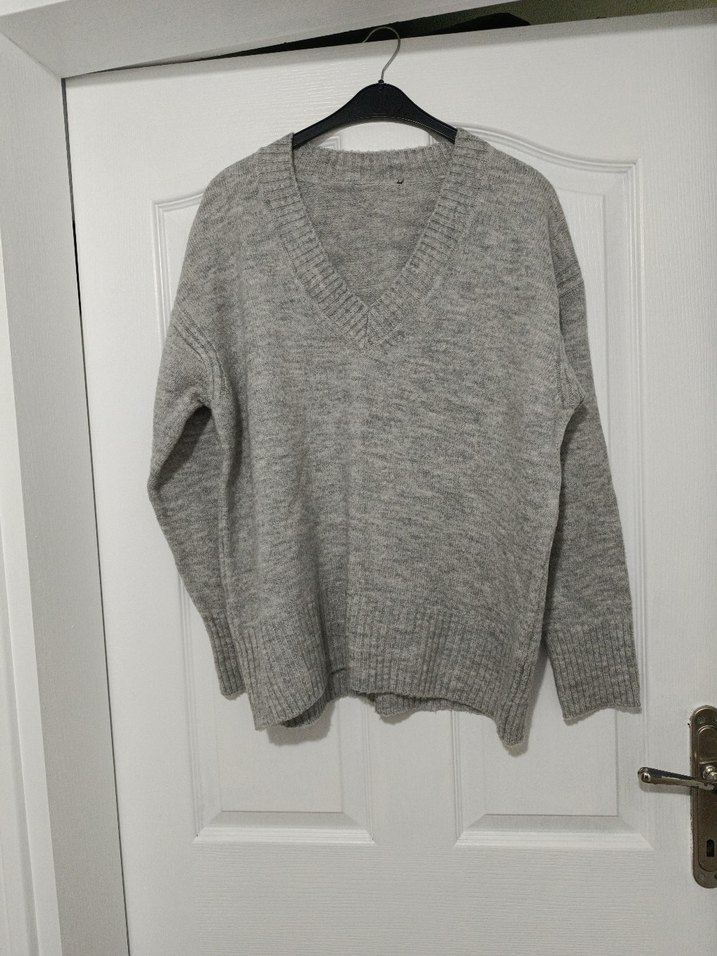 Gri renkli V yakalı, uzun kollu örgü kazak, rahat bir görünüm için bol kesim ve normal boydadır. Desensiz sade tasarımıyla günlük kullanım için uygundur.