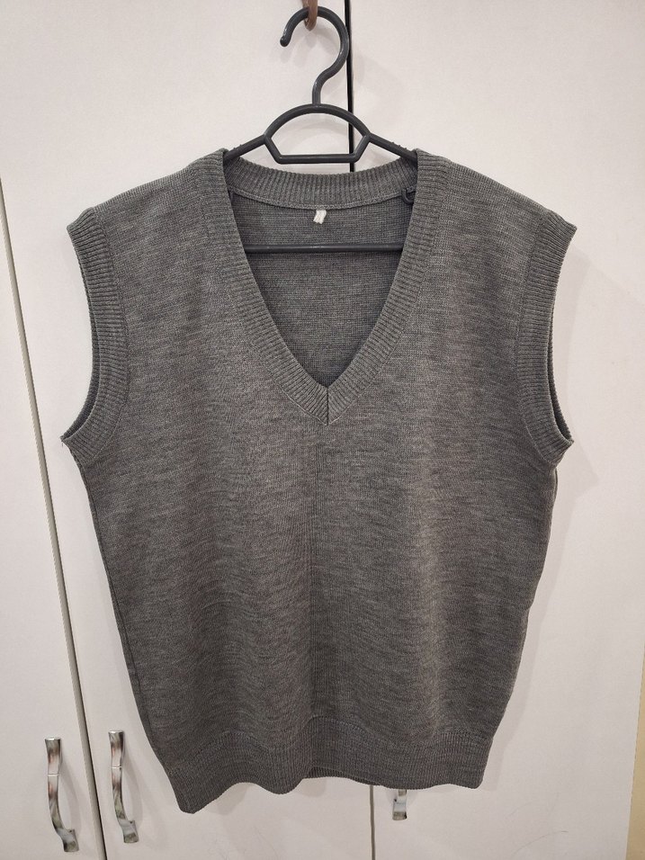 Gri renkli, V yaka ve kolsuz örgü kadın süveter. Yumuşak yün malzemeden, salaş kesim ve normal boyda, günlük sokak stiline uygun.
