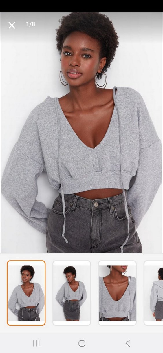 Gri renkte, V yakalı, bol kesim ve uzun kollu kadın sweatshirtü. Denim kumaştan üretilmiş, günlük kullanıma uygun rahat ve şık bir tasarım.