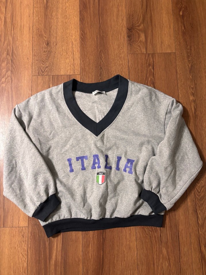 V yaka ve örme manşetlere sahip, ITALIA baskılı bol kesim gri sweatshirt. Günlük rahat kullanım için uygundur.