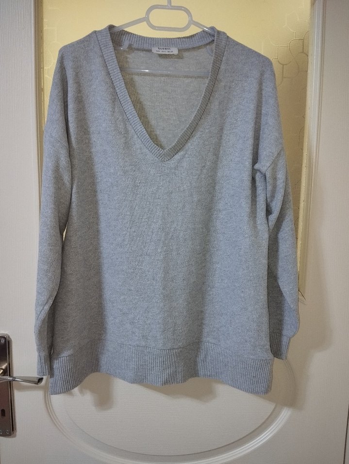 Gri, V yaka, uzun kollu, rahat kesim triko. Yumuşak keten kumaştan, günlük kullanıma uygun, konforlu ve şık görünümlü. 44 bedene uyumlu iki kol arası 60 cm boyu 68 cm