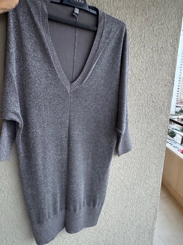 Gri renkte, V yaka ve uzun kollu triko kadın elbise.Bol kesim ve midi boyda, yumuşak triko kumaştan üretilmiştir, günlük kullanıma uygundur. M bedene de olur