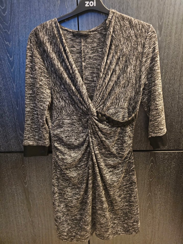 V yaka ve drapeli tasarıma sahip, yumuşak keten kumaştan üretilmiş, vücuda oturan gri triko kadın elbise. Uzun kollu ve midi boyda, günlük kullanıma uygun.