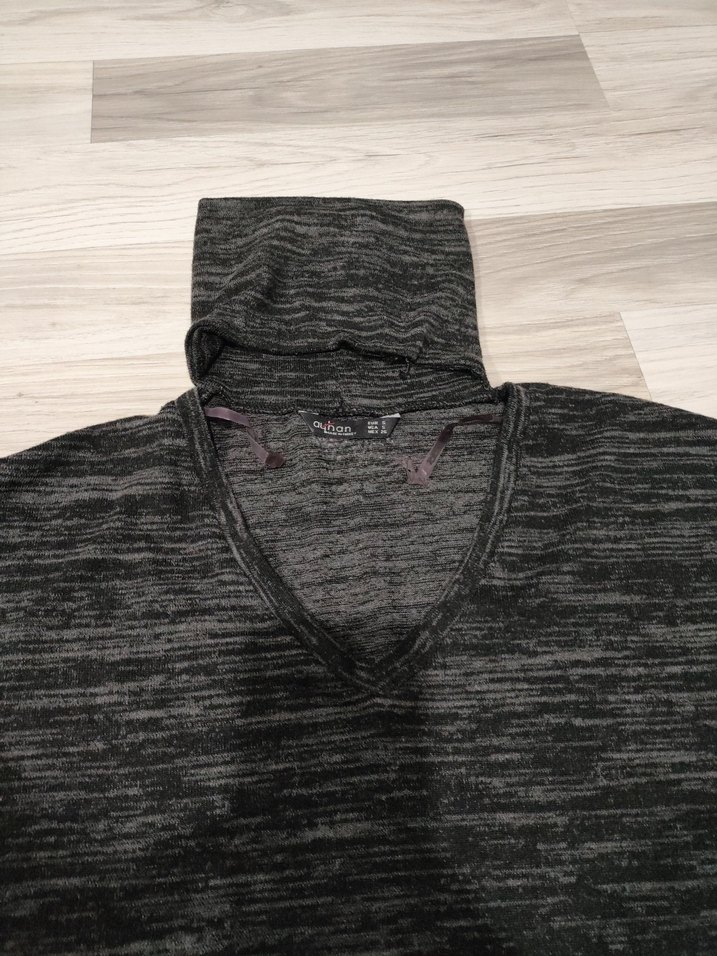 Gri renkli, V yakalı, uzun kollu, bol kesim kadın triko kazak. Örgü yapılı sentetik kumaştan, günlük rahat sokak stili için uygun.