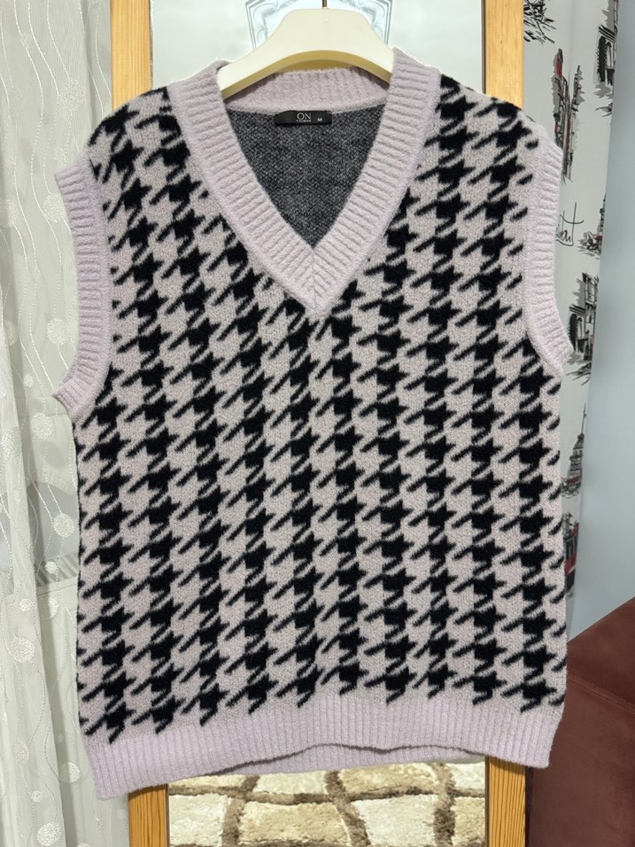Gri kazayağı desenli, V yaka, kolsuz örme kadın triko süveter. Rahat kesimiyle günlük ve sokak stiline uygun, konforlu bir parça.