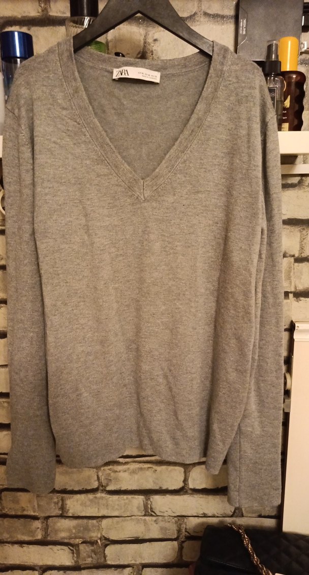 Gri renkli, yün triko V yaka ve uzun kollu kadın kazak. Rahat kesimi ve normal boyuyla günlük kullanıma uygun, konforlu ve şık bir modeldir.