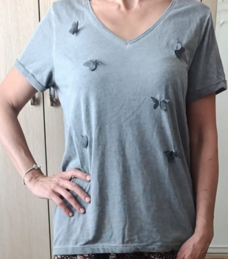 Gri kumaştan, V yaka ve kısa kollu, kelebek baskılı tişört. Günlük rahat sokak stili için uygun. Herhangi bir defosu yoktur. M bedendir. Ölçüleri son iki fotoğrafta görebilirsiniz.