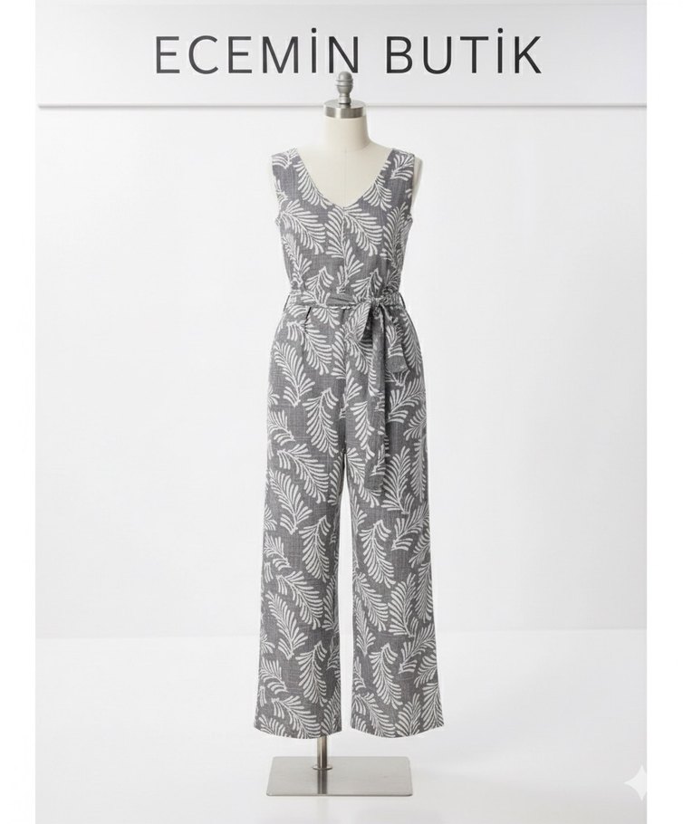 Gri renkte, V yakalı ve kemerli, yumuşak keten kumaştan yapılmış kolsuz tulum.