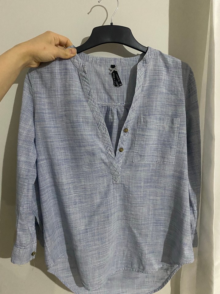 Gri renkte keten kumaştan, düğmeli V yakalı, uzun kollu ve rahat kesimli kadın gömleği. Cep detayı ve desensiz sade tasarımıyla günlük kullanıma uygun.