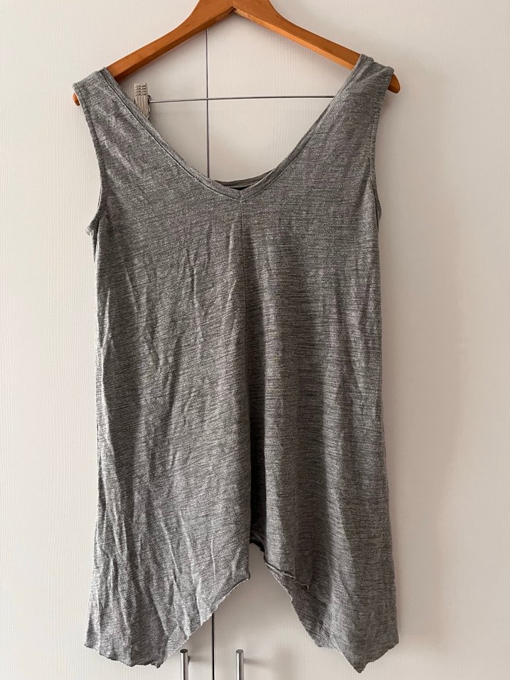 Gri keten kumaştan, V yakalı ve salaş kesim midi uzunluğunda, drapeli kadın atlet. Minimalist ve günlük kullanıma uygun.