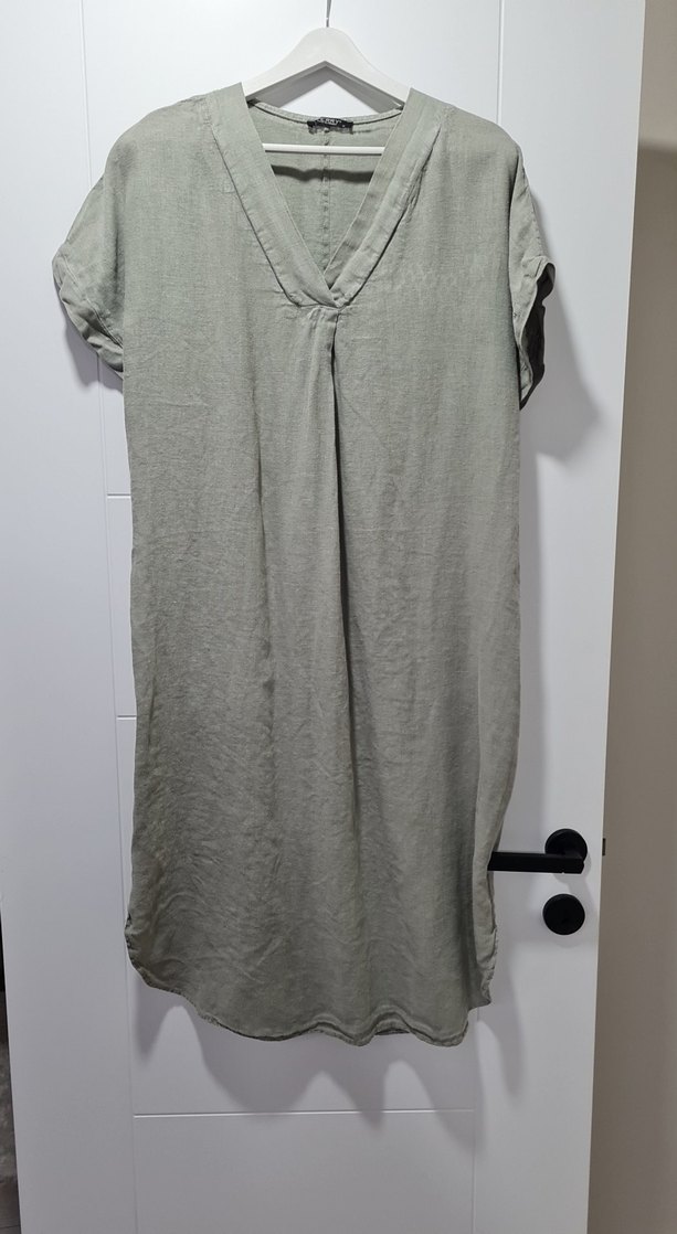 Gri renkte, keten kumaştan yapılmış, V yakalı, kısa kollu ve bol kesim uzun elbise. Salaş bohem tarzı drapeli tasarım içerir.