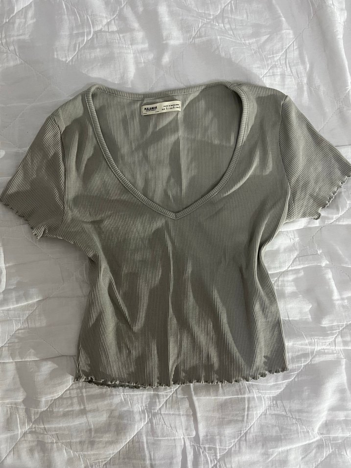 Yumuşak keten kumaştan yapılmış, V yaka ve kısa kollu, gri renkli, vücuda oturan crop top. Normal boyda ve hafif dalgalı etek ucu ile rahat bir sokak stili sunar.